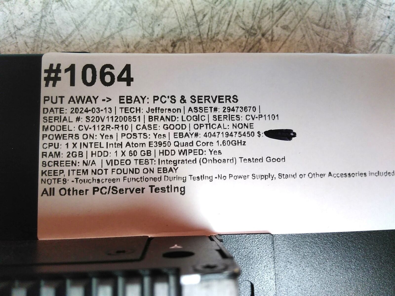 There is an Internal 4"x2" Asset Tag/Inventory Label on Item, This Does Not Impact The Items Performance.