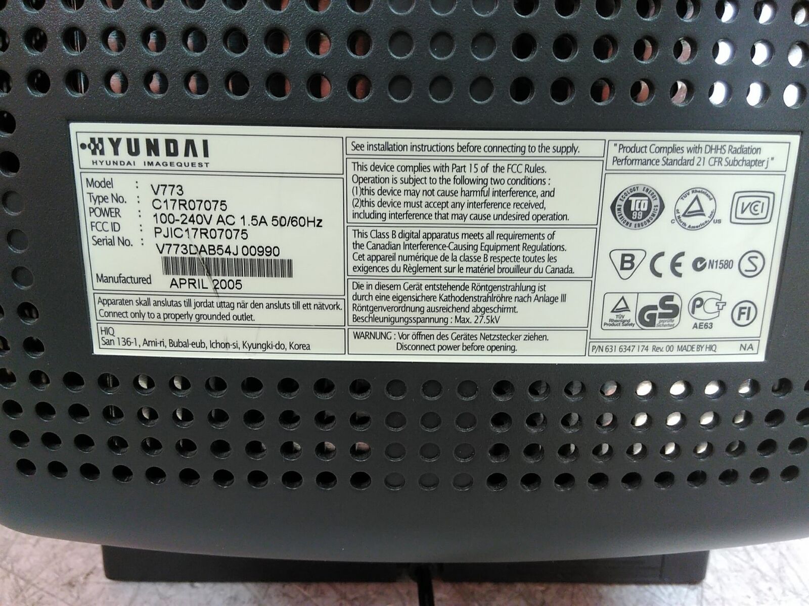 Why purchase from us? Well, I will give you a few reasons: 1. We are one of the few Highly Rated sellers and have met the marketplaces stringent, product, sales, shipping and customer service requirements. 2. We are Trusted sellers with fast shipping, and easy hassle free returns. The Hyundai ImageQuest V773 ImageQuest V773 will ship within 1 business day of cleared payment, you will get a tracking number. 3. We describe all items to the best of our abilities and take detailed photos. 4. Get the item you ordered or get your money back or a replacement item (when available) you choose, we do right buy all our buyers. 5. The Hyundai ImageQuest V773 ImageQuest V773 with our internal  item ID 150972 weighs 34.00 LBS  & measures 23.00 X 20.00 X 23.00 Inches located on rack RM-905B in our warehouse (we stock everything we sell), when your item is paid for our team will begin shipping. Additional product information included below.