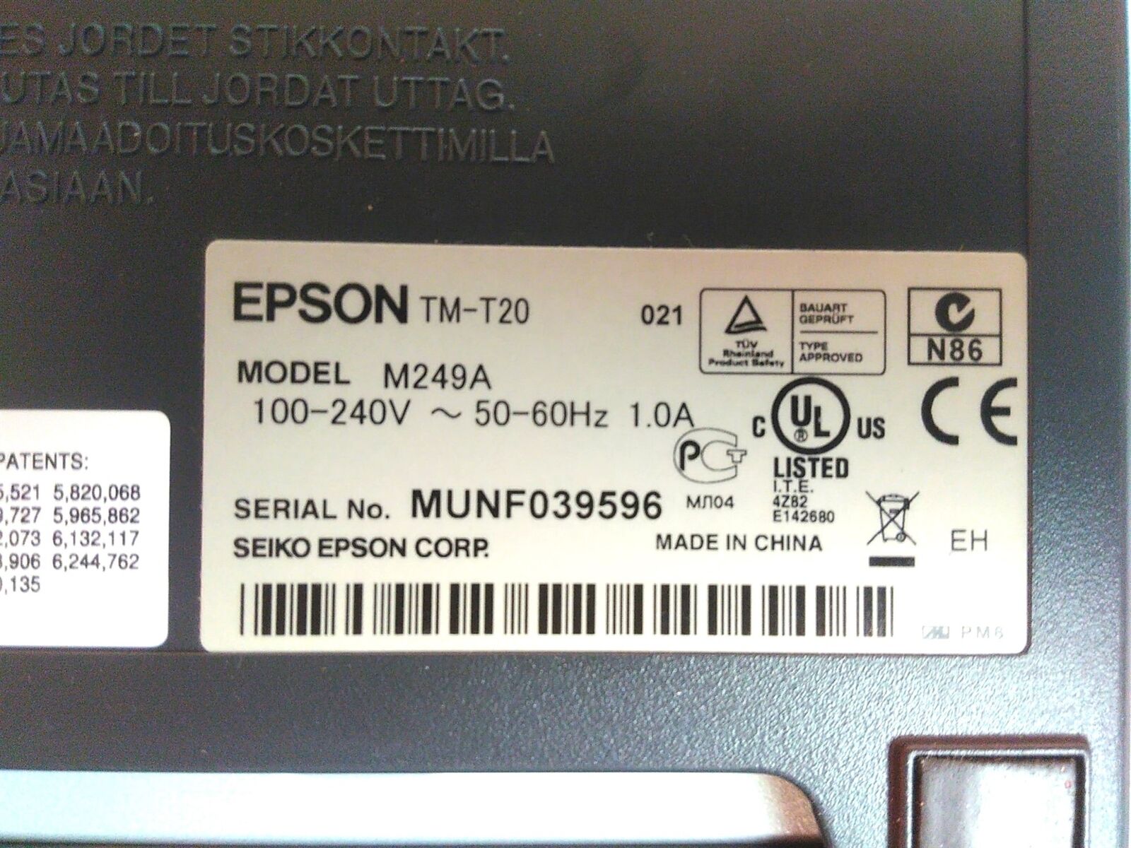 Used Epson M249A TM-T20 USB Thermal Receipt Printer No Paper